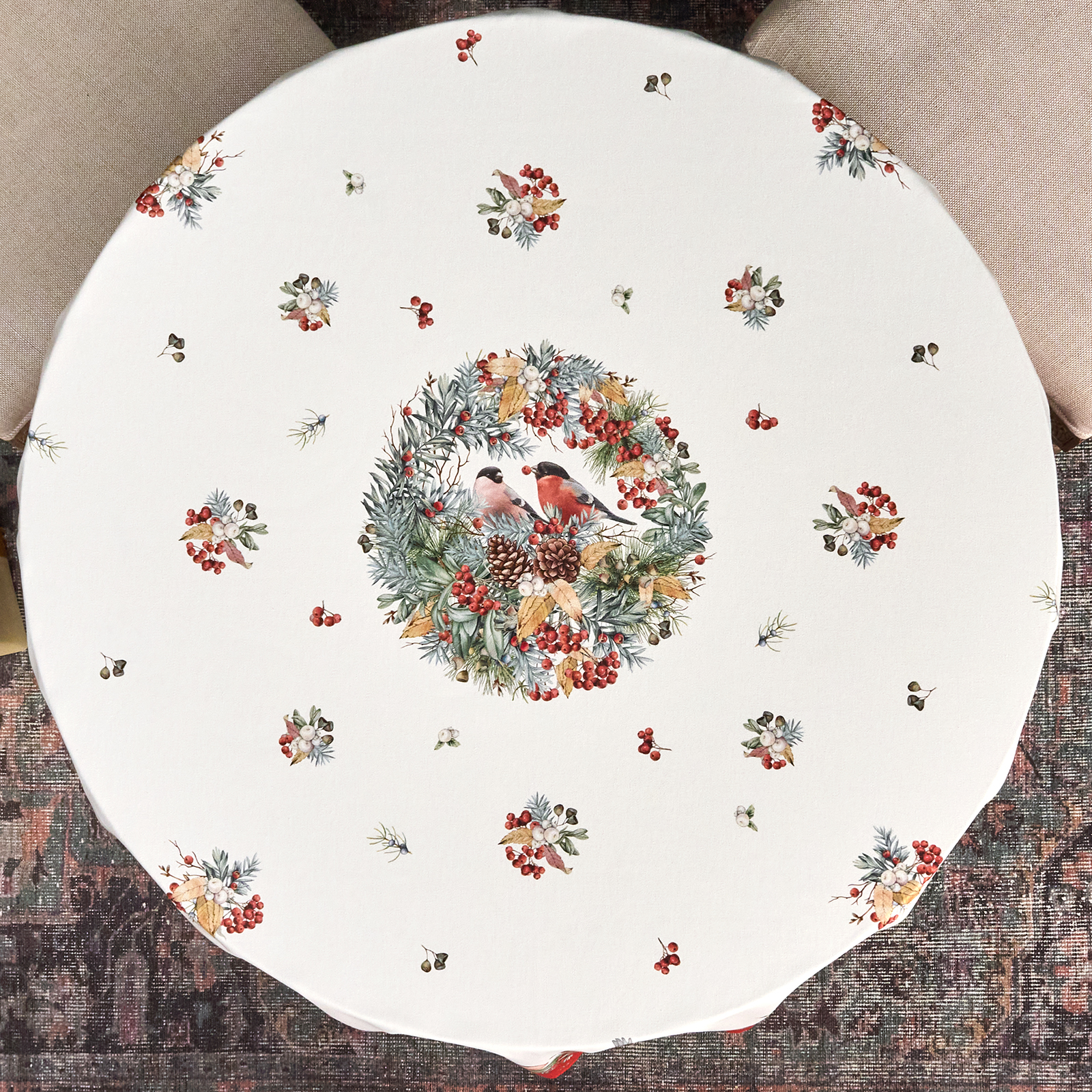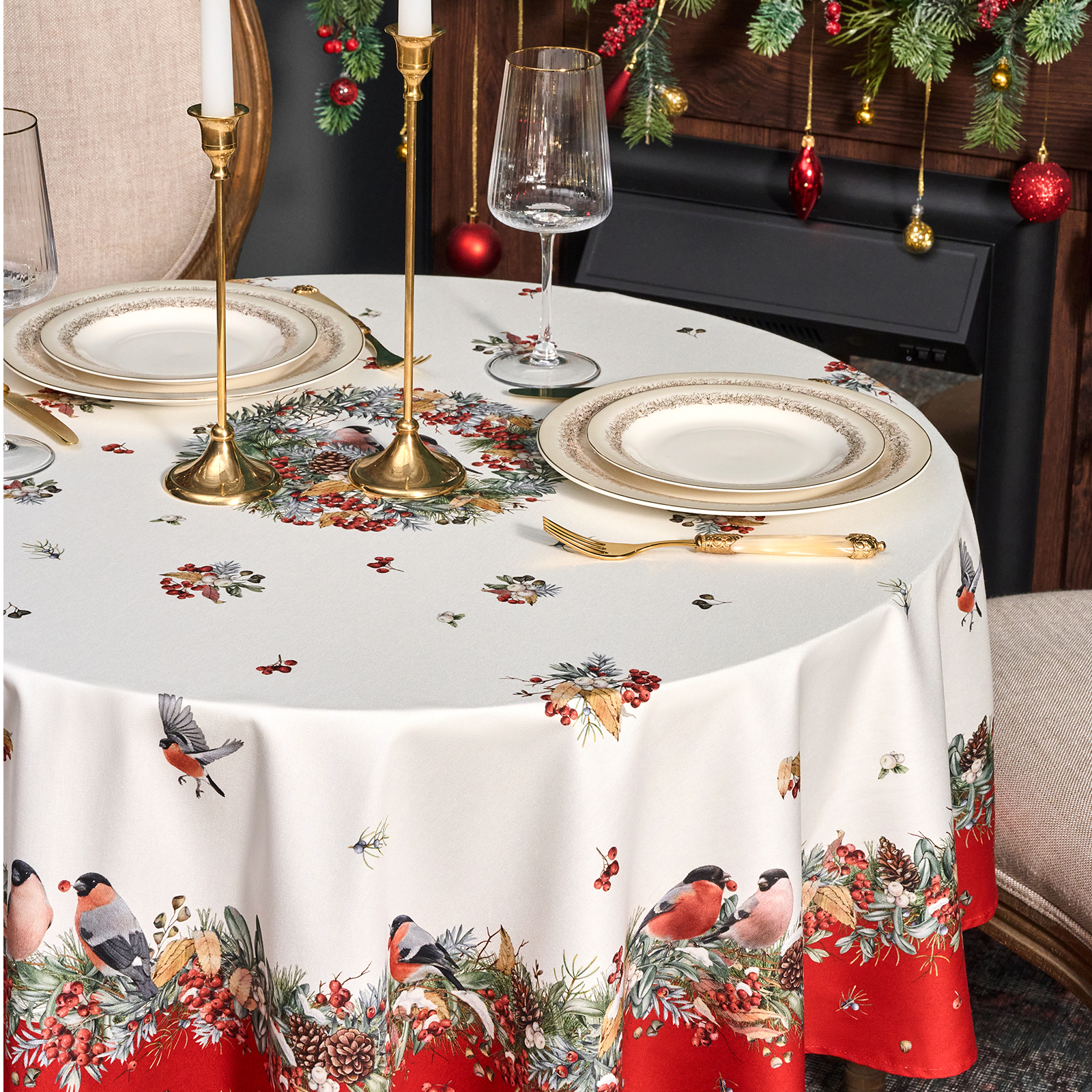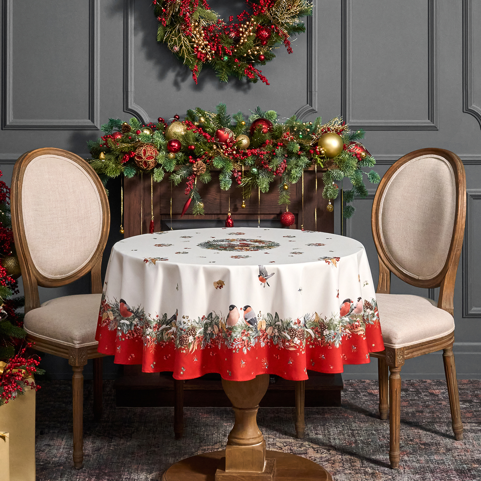 СКАТЕРТЬ "МОРОЗКО.СНЕГИРИ" круглая ,КРАСНЫЙ, 100% ХЛОПОК,ТВИЛ, ПРОПИТКА
