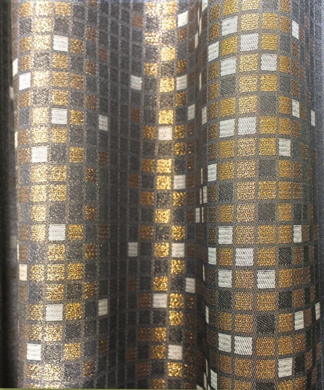 Парча. Торжественная и нарядная ткань с медной люрексовой нитью. Текстура средней плотности. Светонепроницаемость 70%. Крепление на шторной ленте. Изделия очень долговечны, легки в уходе, не теряют качественного состояния долгие годы. Производство известной польской фабрики "WISAN".