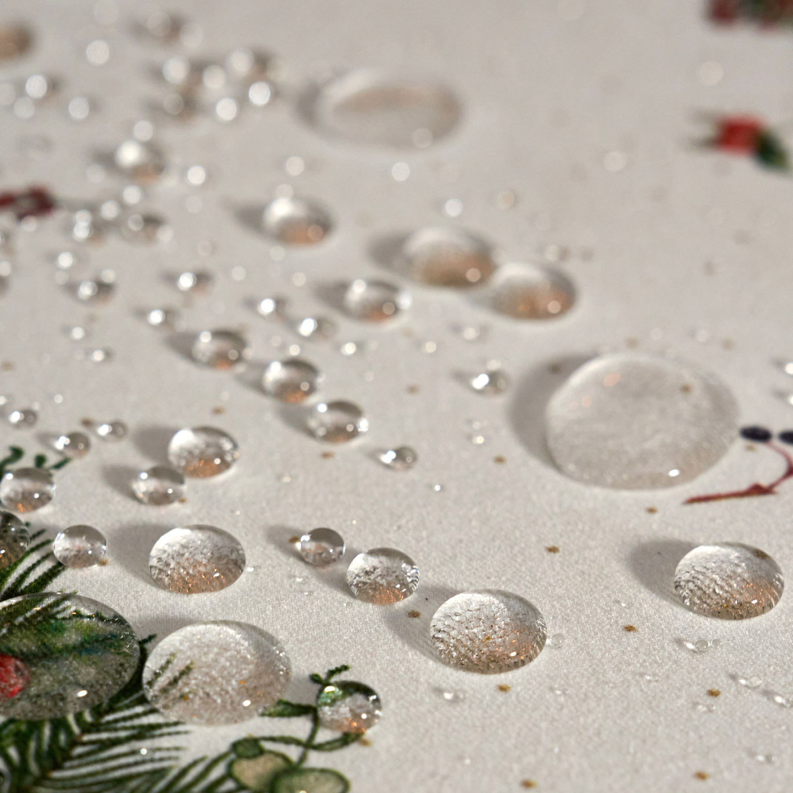 Скатерть выполнена из 100% хлопка с саржевым переплетением (твил). Ткань плотная — 190 г/м², не мнётся, не теряет форму, выдерживает стирку более 100 раз. Специальная водоотталкивающая пропитка защищает от пролитой жидкости, облегчая уход.