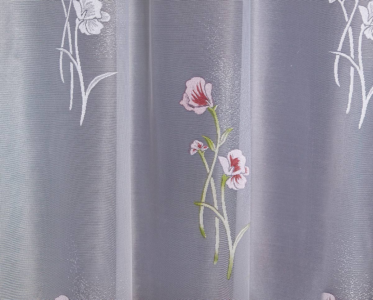Белоснежный жаккардовый тюль с вытканным цветным рисунком и сложной рельефной фактурой. Крепление на шторной ленте.