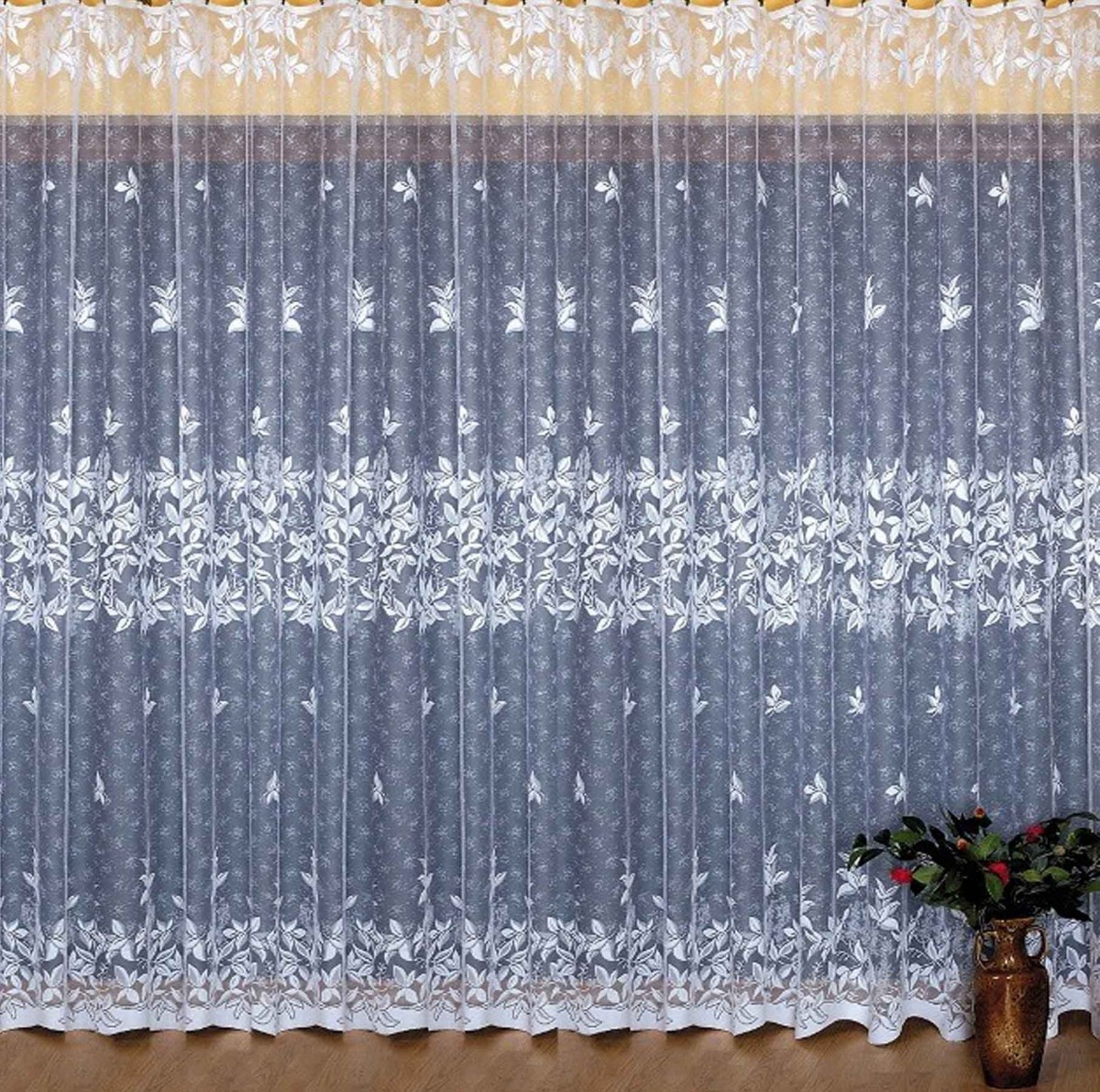 Белоснежный жаккардовый тюль от известной польской фабрики. Сетчатая основа полотна с вытканным на ней фактурным узором из блестящей пряжи. Изделия фабрики славятся своими высокими потребительскими качествами. Даже по истечении многих лет использования, они не потеряют формы и цвета. Крепление на шторной ленте.